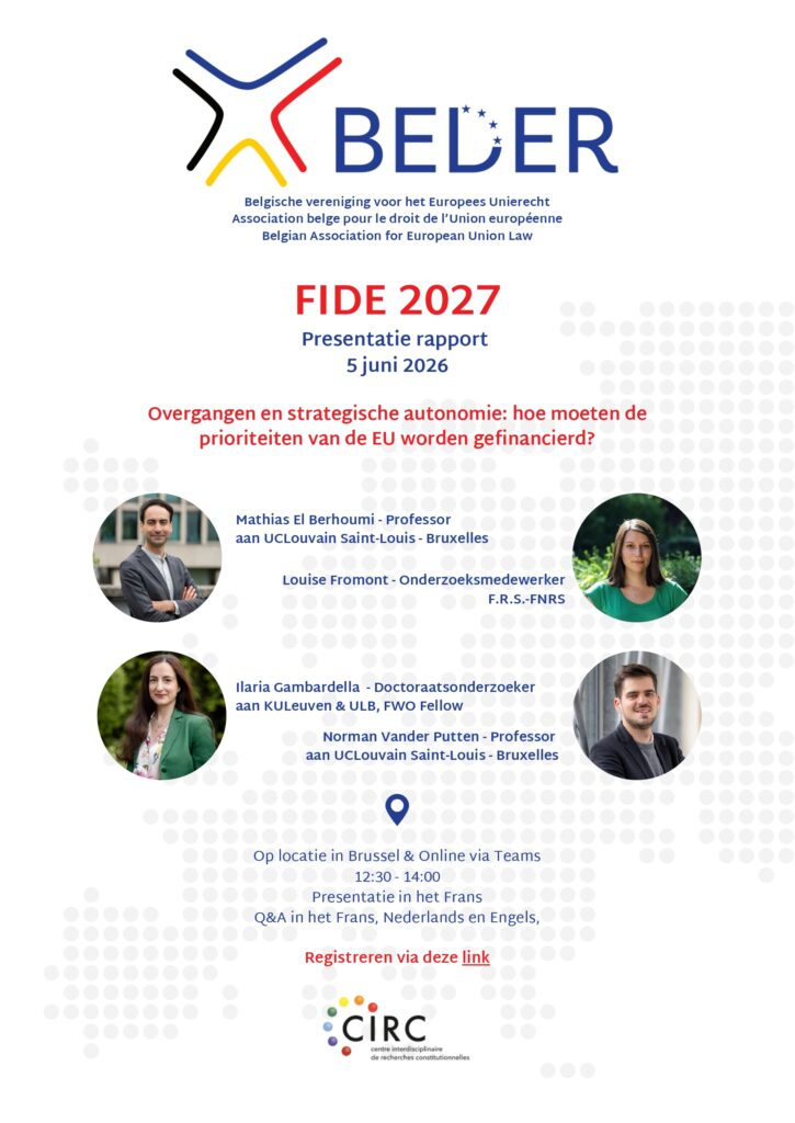 📌 De eerste presentatie (Topic I – Financing the Priorities of the Union: Budget, Own Resources, Common Debt, Private Investing), georganiseerd in samenwerking met het Interdisciplinair Centrum voor Constitutioneel Onderzoek (CIRC), vindt plaats op vrijdag 5 juni 2026 van 12.30 tot 14.00 uur, zowel online als in de lokalen van de UCLouvain Saint-Louis. Het team van rapporteurs, bestaande uit Norman Van der Putten, Mathias El Berhoumi, Louise Fromont en Ilaria Gambardella, zal de resultaten van hun werk presenteren en vragen van de deelnemers beantwoorden.