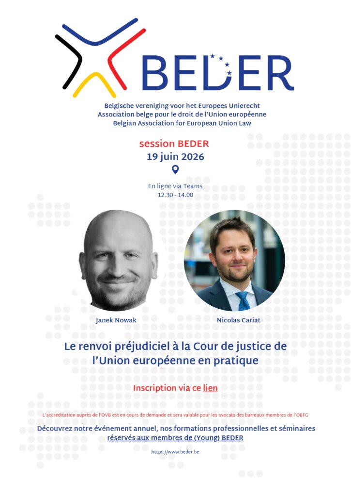 Le 19 juin 2026, BEDER organise un séminaire en ligne intitulé « Les questions préjudicielles à la Cour de justice de l’Union européenne en pratique ». L’inscription peut se faire via ce lien.